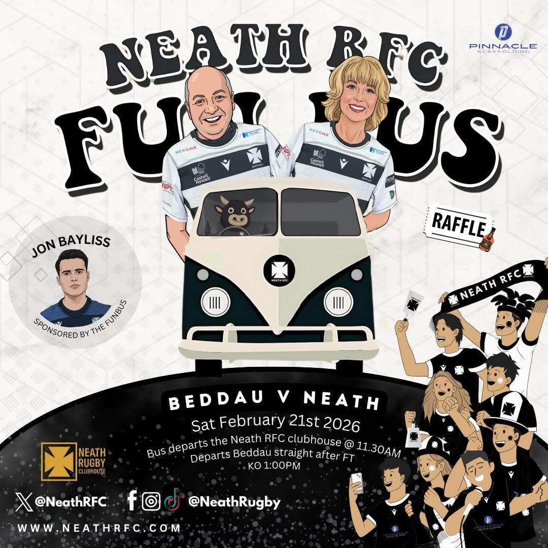 Would you like to hop on the FUN BUS to BEDDAU for our next premiership league game? 📆 Date: Feb 21st 2026 ⏰ 11:30am from Neath Rugby Clubhouse (Kickoff: 1:00pm) 📍 🍻: BEDDAU RFC CLUBHOUSE The Clubhouse, Beddau RFC, Castellau Rd, Beddau, CF38 2AA 📍🏟️ : BEDDAU CLUB GROUND Mount