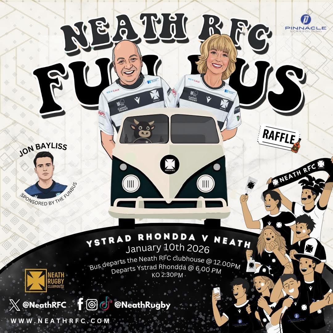 Would you like to hop on the FUN BUS to YSTRAD RHONDDA for our next premiership league game? 📆 Date: 10th January 2026 ⏰ 12:00pm from Neath Rugby Clubhouse (Kickoff: 2:30pm) 📍 🍻: YSTRAD RHONDDA RFC CLUBHOUSE 82,Gelligaled Road, Ystrad Rhondda, R.C.T, CF41 7RQ. 📍🏟️ : YSTRAD
