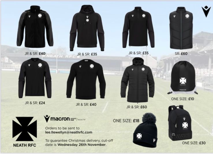 Neath RFC official macron leisure wear is available to order. If you want any clothing, you have until the 26th Nov to get the order in ready for Christmas. Orders and enquiries via email to: lee.llewellyn@neathrfc.com